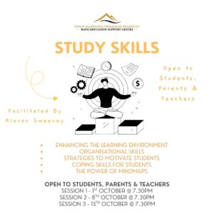 Mayo Education Centre will run a Study Skills Webinar Series starting this October the 1st at 7.30pm. This seminar is free and open to Students, Parents and Teachers alike.